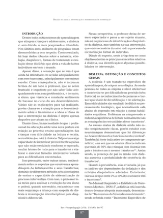O documento discute a dislexia, um transtorno de aprendizagem que afeta a leitura e escrita. Apresenta suas principais características, causas e prevalência. Destaca a importância da identificação precoce e intervenção adequada para minimizar seus efeitos negativos. Discute conceitos sobre dislexia e possibilidades de intervenção na escola, com foco na educação infantil e séries iniciais.