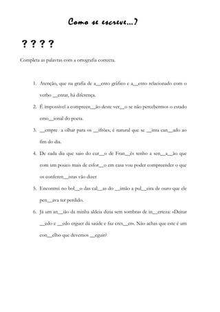 Este documento contém uma série de exercícios de ortografia focados nos sons S, K, G/J e Z. Os exercícios pedem aos estudantes que completem palavras com as letras apropriadas para esses sons. Além disso, inclui exercícios sobre a distinção entre O e U e sobre a pontuação correta.