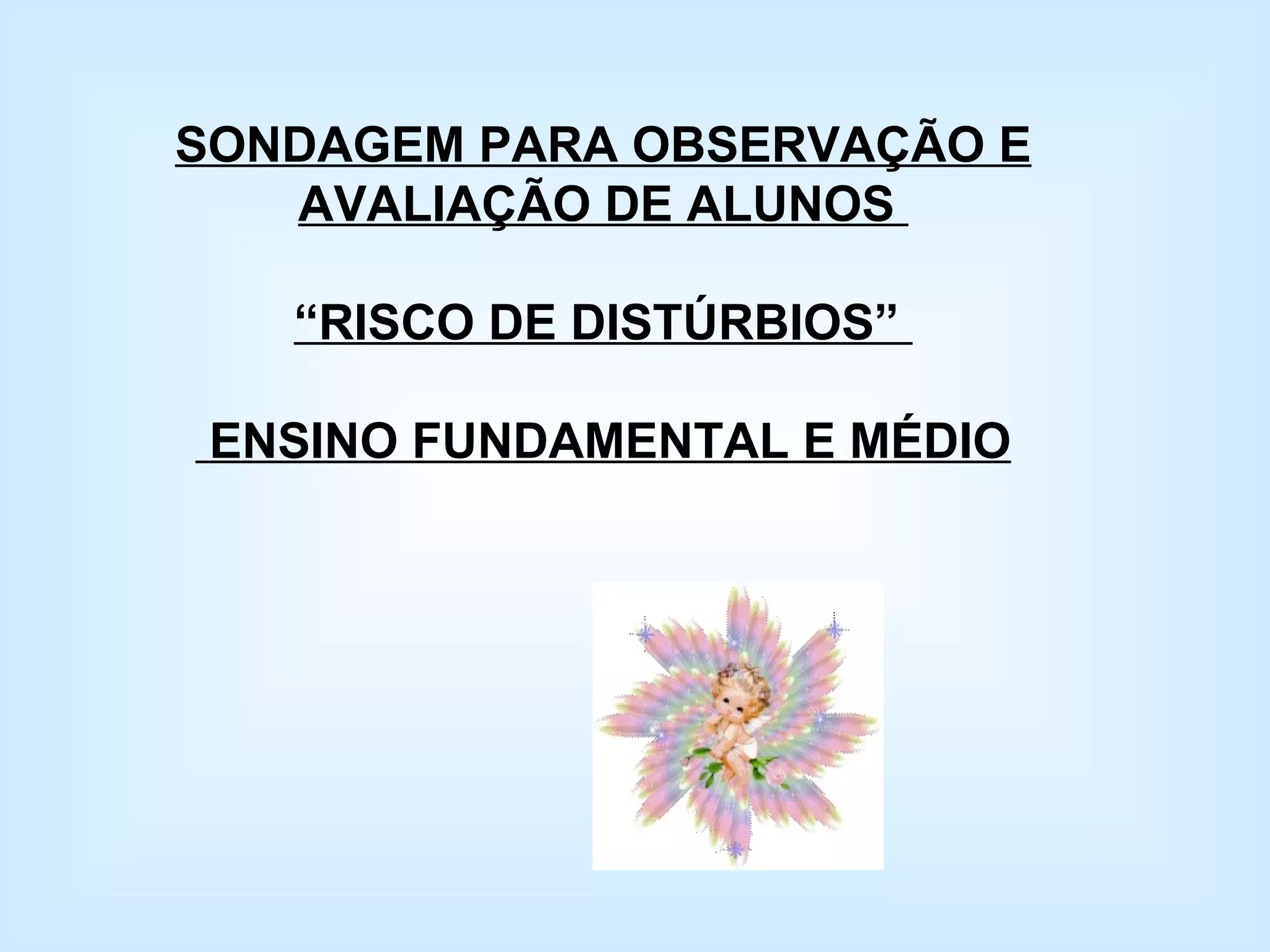 Este documento apresenta uma sondagem para observação e avaliação de alunos com possíveis distúrbios no ensino fundamental e médio. A sondagem aborda aspectos como adequação à proposta, atenção, apresentação, elaboração e sequência de ideias, pontuação, ortografia e gradação de prioridades para interferência na escrita dos alunos.