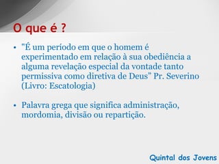 O documento descreve os diferentes "quintais dos jovens" ou períodos dispensacionais na história da salvação segundo a Bíblia: (1) o tempo da inocência entre a criação e a queda, (2) o tempo da consciência entre a queda e o dilúvio, (3) o tempo do governo do homem entre o dilúvio e Abraão.
