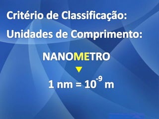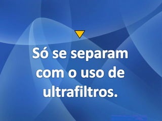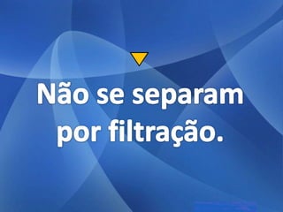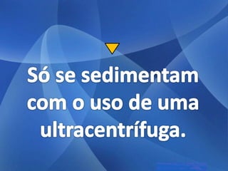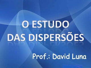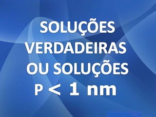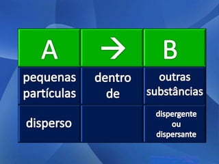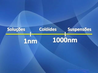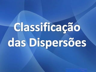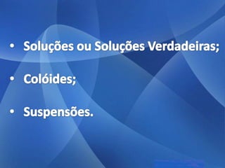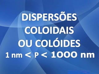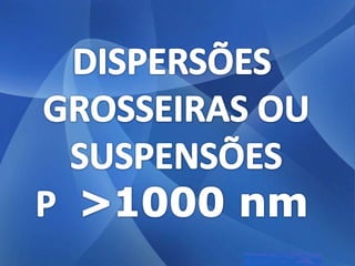As três principais categorias de dispersões são soluções, colóides e suspensões. Soluções têm partículas invisíveis que não sedimentam nem são retidas por filtros comuns. Colóides têm partículas visíveis que sedimentam apenas com ultracentrifugação ou são retidas por ultrafiltração. Suspensões têm partículas visíveis que sedimentam pela gravidade e são retidas por filtros comuns.