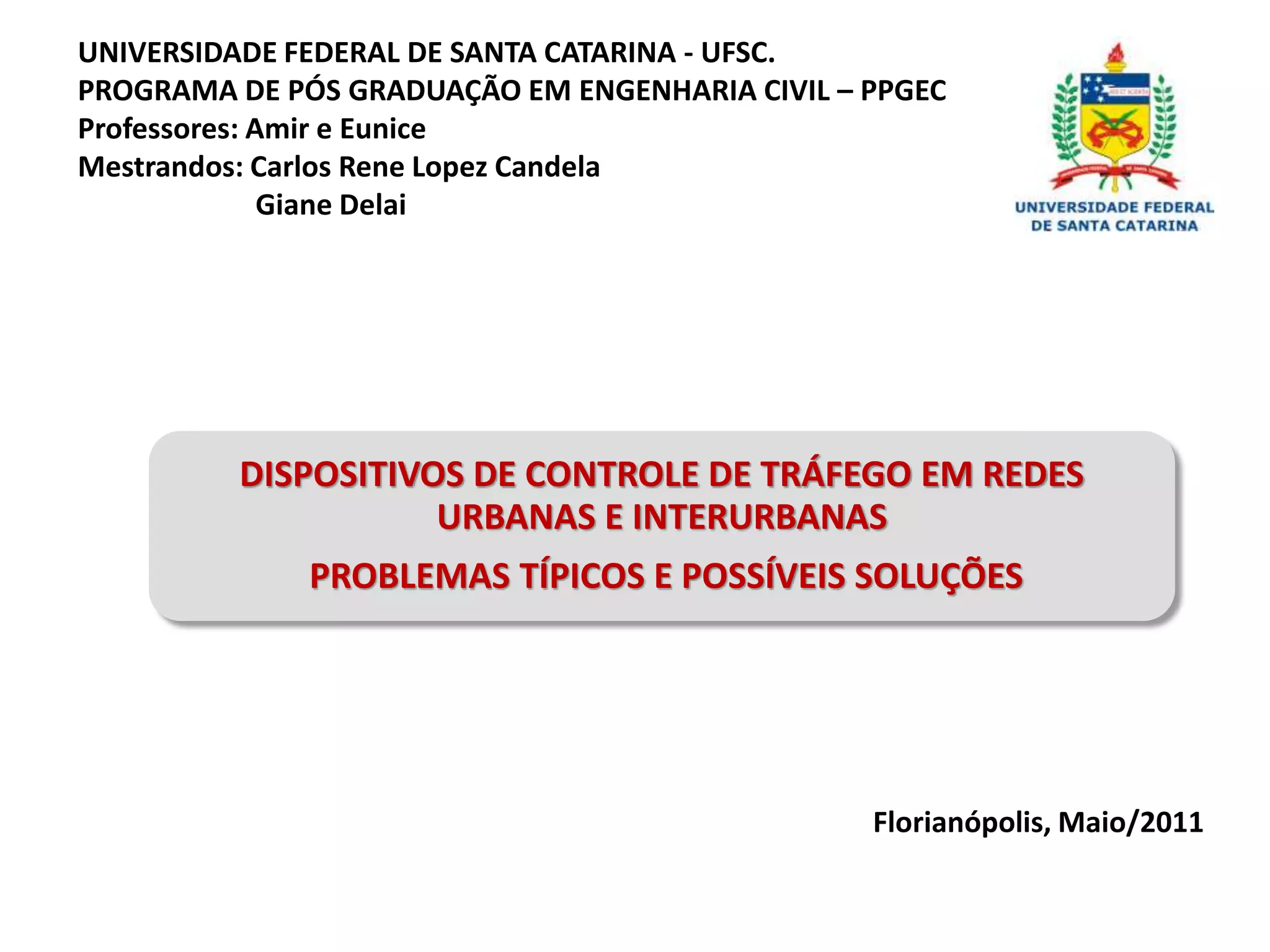 O documento discute dispositivos de controle de tráfego, incluindo suas funções gerais e específicas, a uniformidade dos sinais, problemas comuns e tipos de dispositivos como lombadas, cruzamentos elevados, fechamentos de ruas e controladores eletrônicos de velocidade.