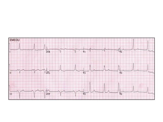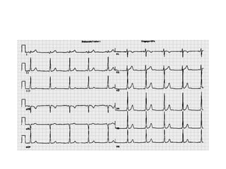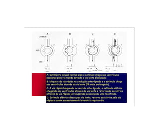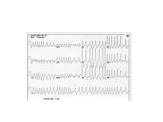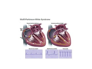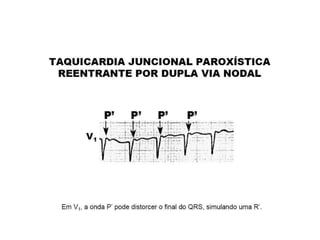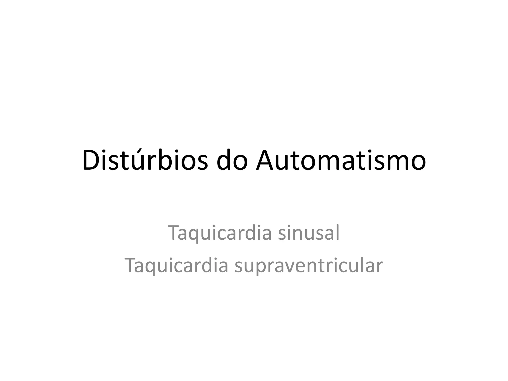 O documento discute distúrbios do ritmo cardíaco como taquicardia sinusal e taquicardia supraventricular. A taquicardia sinusal é um aumento da frequência cardíaca acima de 100 bpm que pode ser fisiológico ou patológico. A taquicardia supraventricular inclui taquicardia atrial e nodal e ocorre por reentrada nodal, sendo comum na Síndrome de Wolf-Parkinson-White. O diagnóstico e tratamento dessas arritmias envolve análise clínica