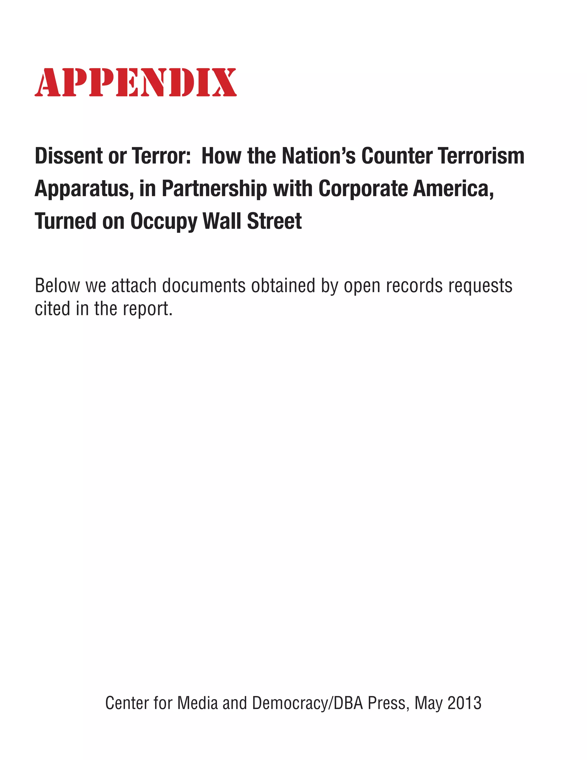 O documento apresenta vários documentos obtidos por meio de pedidos de acesso à informação citados em um relatório sobre como o aparato de contraterrorismo dos EUA, em parceria com empresas americanas, se voltou contra o movimento Occupy Wall Street. Os documentos são anexados ao relatório produzido pelo Centro para Mídia e Democracia/DBA Press em maio de 2013.