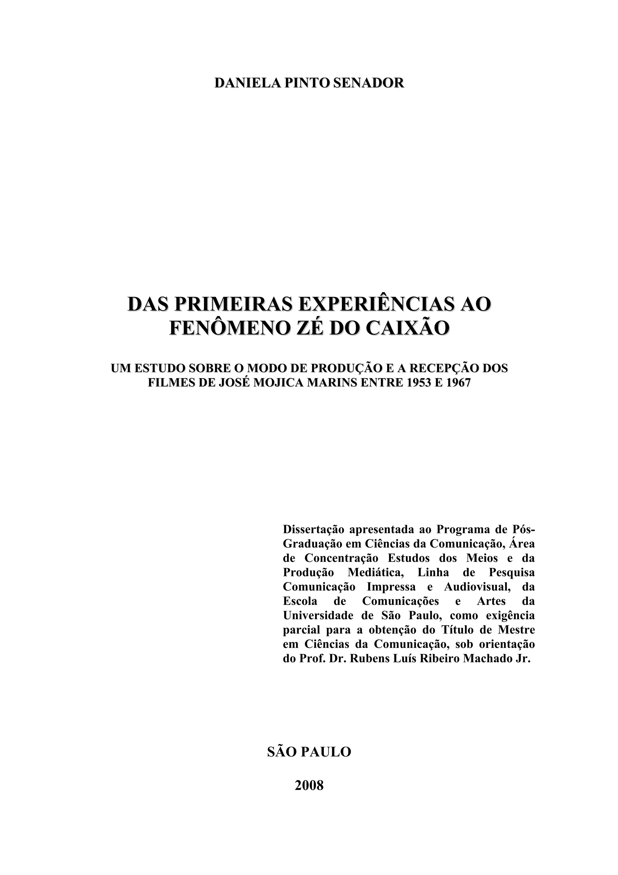 Este documento apresenta uma dissertação de mestrado sobre o modo de produção e recepção dos primeiros filmes do diretor José Mojica Marins entre 1953 e 1967. O trabalho analisa a trajetória do cineasta no contexto do cinema amador paulista, o processo de produção de cada um de seus longas durante esse período e a repercussão na mídia impressa.