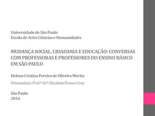 Este documento resume as principais ideias discutidas por professores da rede pública de ensino de São Paulo sobre mudança social, cidadania e educação durante rodas de conversa realizadas pela autora. Os professores debateram sobre como a educação pode promover cidadãos agentes de mudança social, as funções do Estado e da política, a atual conjuntura social e educacional e o tipo de sociedade que gostariam de ver.