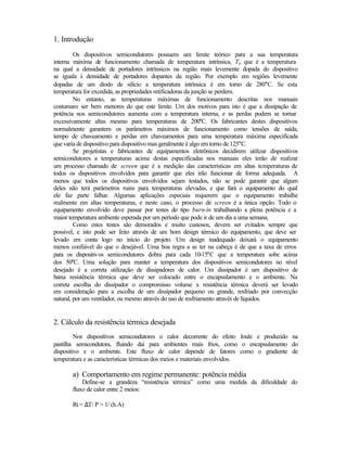 1) Os dissipadores de calor são usados para manter a temperatura de dispositivos semicondutores abaixo do limite máximo, removendo o calor gerado. 2) Existem três tipos principais de dissipadores: resfriados por convecção natural, ventilação forçada e líquidos. 3) Fatores como o material, design das aletas e posicionamento afetam a resistência térmica e eficiência do dissipador.