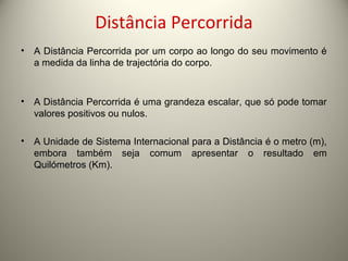 1) A distância percorrida por um corpo é a medida da linha de trajetória ao longo do movimento. 2) O deslocamento é determinado pela diferença entre o ponto inicial e final, independente da trajetória, e é representado por um vetor. 3) O deslocamento de um automóvel que se moveu de A para B foi de 30km.