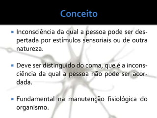 1) O documento discute os principais aspectos relacionados ao sono, incluindo suas definições, estágios, mecanismos neurais e distúrbios. 2) Aborda os principais distúrbios do sono como insônia, hipersonias, transtornos do ciclo circadiano e parassonias. 3) Discorre sobre os principais exames para avaliação do sono, em especial a polissonografia.