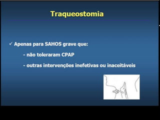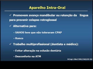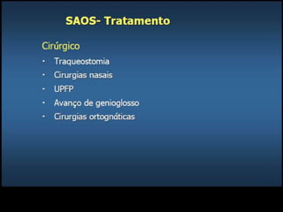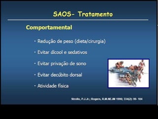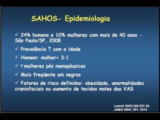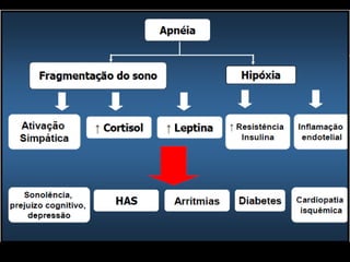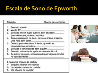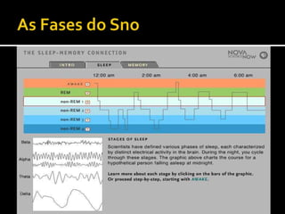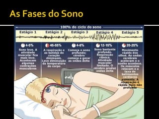 O documento discute os estágios do sono, dividindo-o em sono REM e não-REM, que ocorrem em ciclos de aproximadamente 90 minutos. Também aborda as características fisiológicas de cada fase do sono e do distúrbio respiratório obstrutivo do sono.