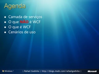 Rafael Godinho is a Microsoft developer specialist based in Brazil. The document discusses Windows Communication Foundation (WCF) and provides an overview of service-oriented architecture, WCF hosting and binding options, and common WCF usage scenarios.