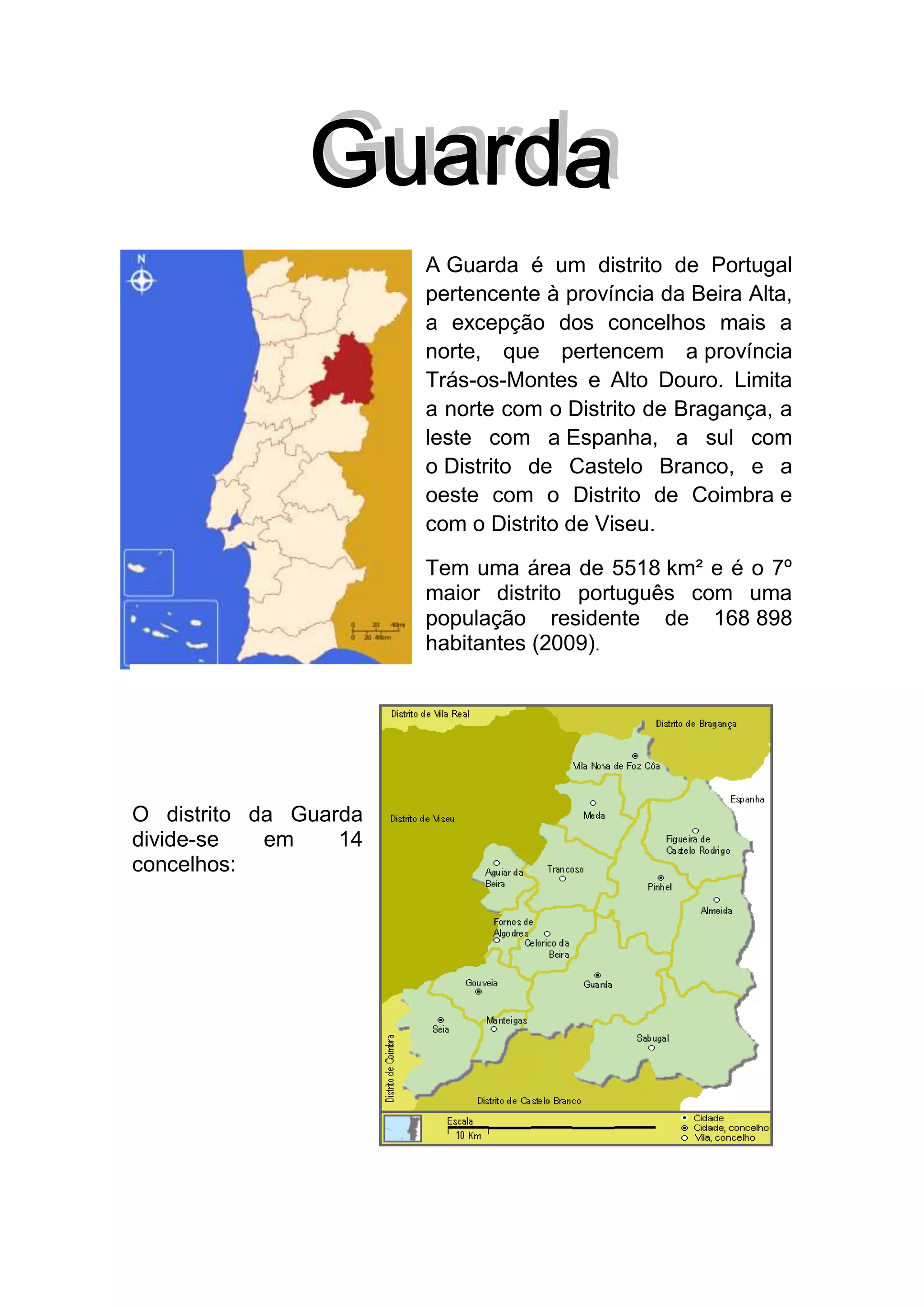 O documento fornece informações sobre o distrito da Guarda em Portugal. Localizado na região da Beira Alta, limita-se com outros distritos portugueses e com a Espanha. Tem uma área de 5.518 km2 e população de cerca de 169 mil habitantes. Divide-se em 14 concelhos e é conhecido pela Serra da Estrela, a cidade mais elevada de Portugal.