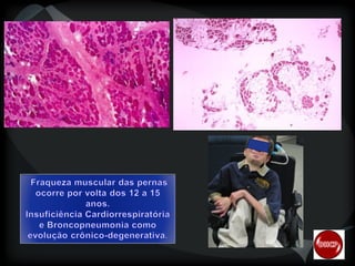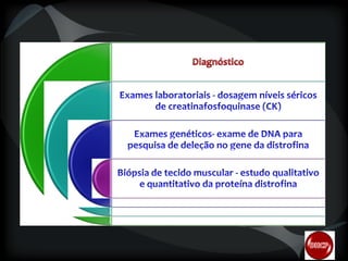 A distrofia muscular de Duchenne é uma doença hereditária e progressiva que afeta o tecido muscular esquelético. Ela ocorre devido à degeneração da membrana que envolve as células musculares, levando à morte celular e necrose muscular. A distrofia muscular de Duchenne atinge principalmente meninos e ocorre em aproximadamente 20 a 30 casos a cada 100 mil nascidos do sexo masculino.