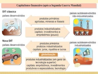 A Divisão Internacional do Trabalho (DIT) surgiu com as grandes navegações e expansão do capitalismo, especializando a produção entre países. A DIT evoluiu com a revolução industrial e imperialismo, e mais recentemente estruturou-se em quatro posições na economia global: produtores de alto valor, grande volume e baixo custo, matérias-primas, e trabalho desvalorizado.