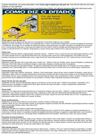 O documento explica a origem e significado de diversas expressões idiomáticas em português, incluindo "O pior cego é aquele que não quer ver", "Andar à toa" e "Casa de mãe Joana". As expressões remontam a casos históricos na França, Itália e Portugal e muitas sofreram alterações de significado ao serem trazidas para o Brasil.