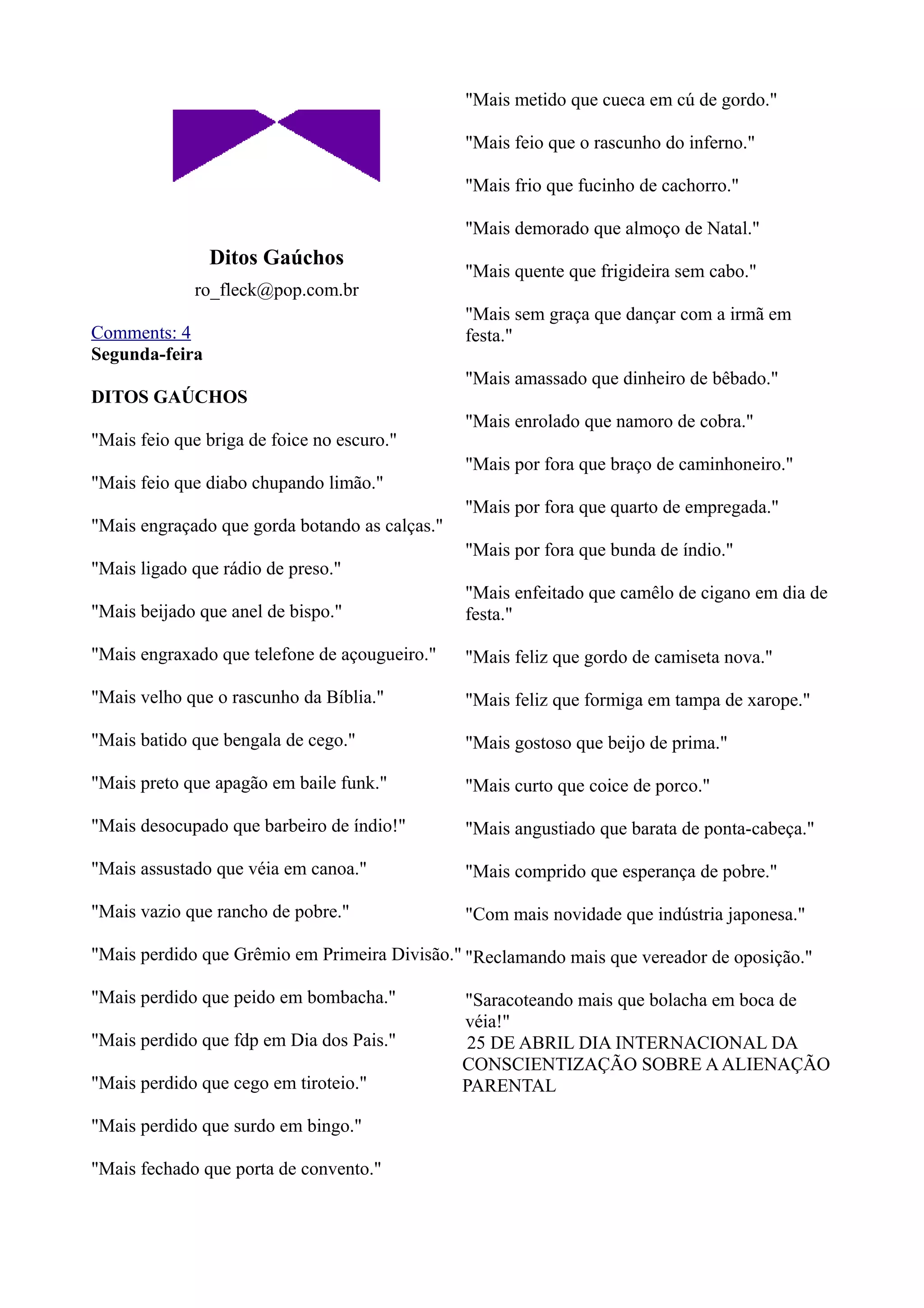 O documento lista diversos ditos populares gaúchos que descrevem situações de forma humorística e comparativa. As frases fornecem comparações coloridas entre situações do cotidiano e aspectos da cultura regional para caracterizar algo de forma enfática.