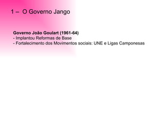 O documento descreve o governo de João Goulart (1961-1964) no Brasil, marcado pela abertura a movimentos sociais e reformas, causando preocupação nas classes conservadoras. Isso levou a um golpe militar em 1964 que instaurou uma ditadura até a redemocratização gradual na década de 1970. O documento também discute os efeitos econômicos e sociais desse período, como a concentração de renda e aumento da pobreza.