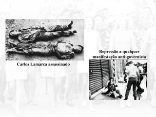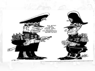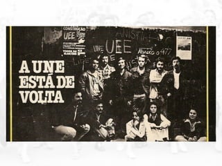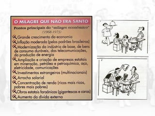 O documento descreve o período da ditadura militar no Brasil entre 1964-1985, destacando: 1) A repressão e censura implementadas pelos governos; 2) O "milagre econômico" e suas consequências sociais adversas; 3) O início da abertura política no governo Geisel e a luta pela redemocratização.
