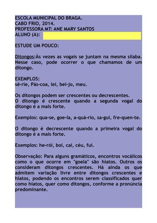 O documento explica o que são ditongos, dando exemplos de ditongos crescentes e decrescentes. Também pede para identificar se palavras específicas contêm ditongos crescentes ou decrescentes.