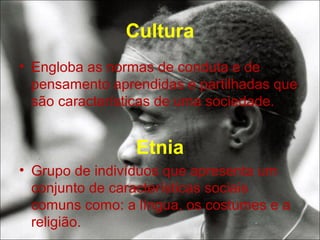 O documento discute a diversidade cultural e os principais fatores de identidade das populações, incluindo língua, religião e características físicas. A cultura é formada por elementos materiais e não materiais que variam entre grupos. A língua e a religião são dois dos principais fatores que distinguem os grupos culturais.