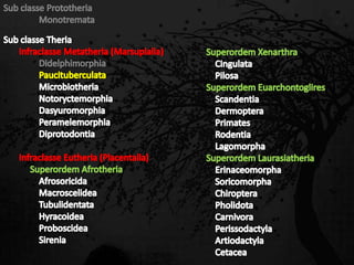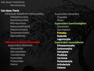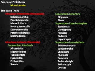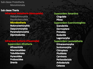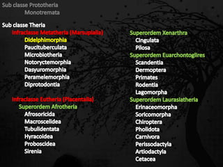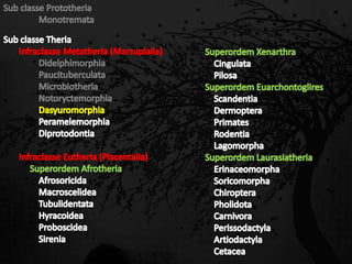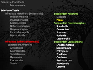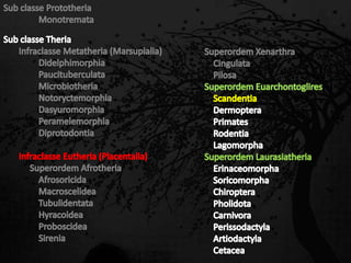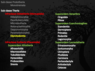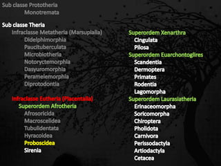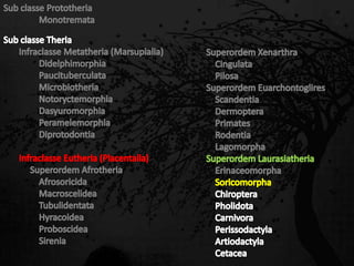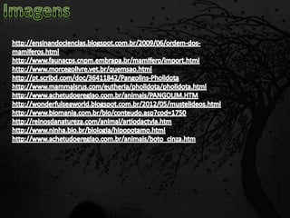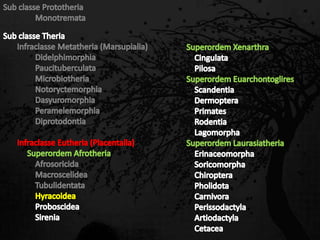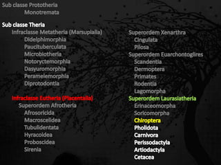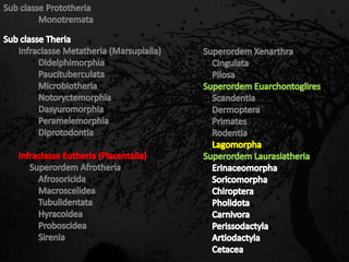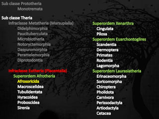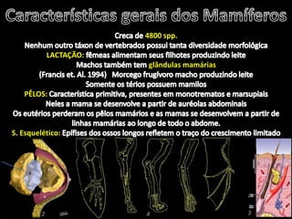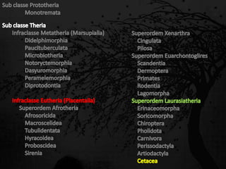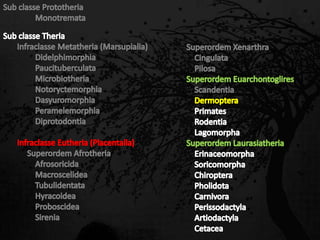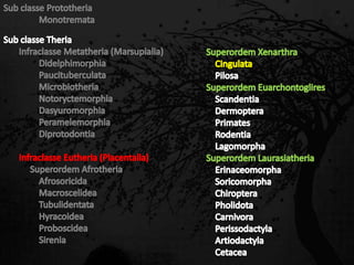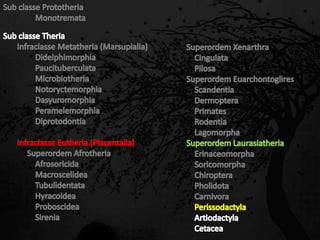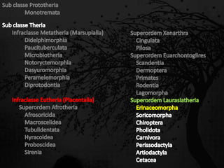 Esta passagem descreve as principais características de diversas ordens de mamíferos. Aborda os monotremados, que põem ovos; os marsupiais, que têm bolsas para amamentar filhotes imaturos; e os placentários, que desenvolvem filhotes internamente. Também fornece detalhes sobre adaptações anatômicas e de estilo de vida de grupos como tatus, preguiças, elefantes e baleias.