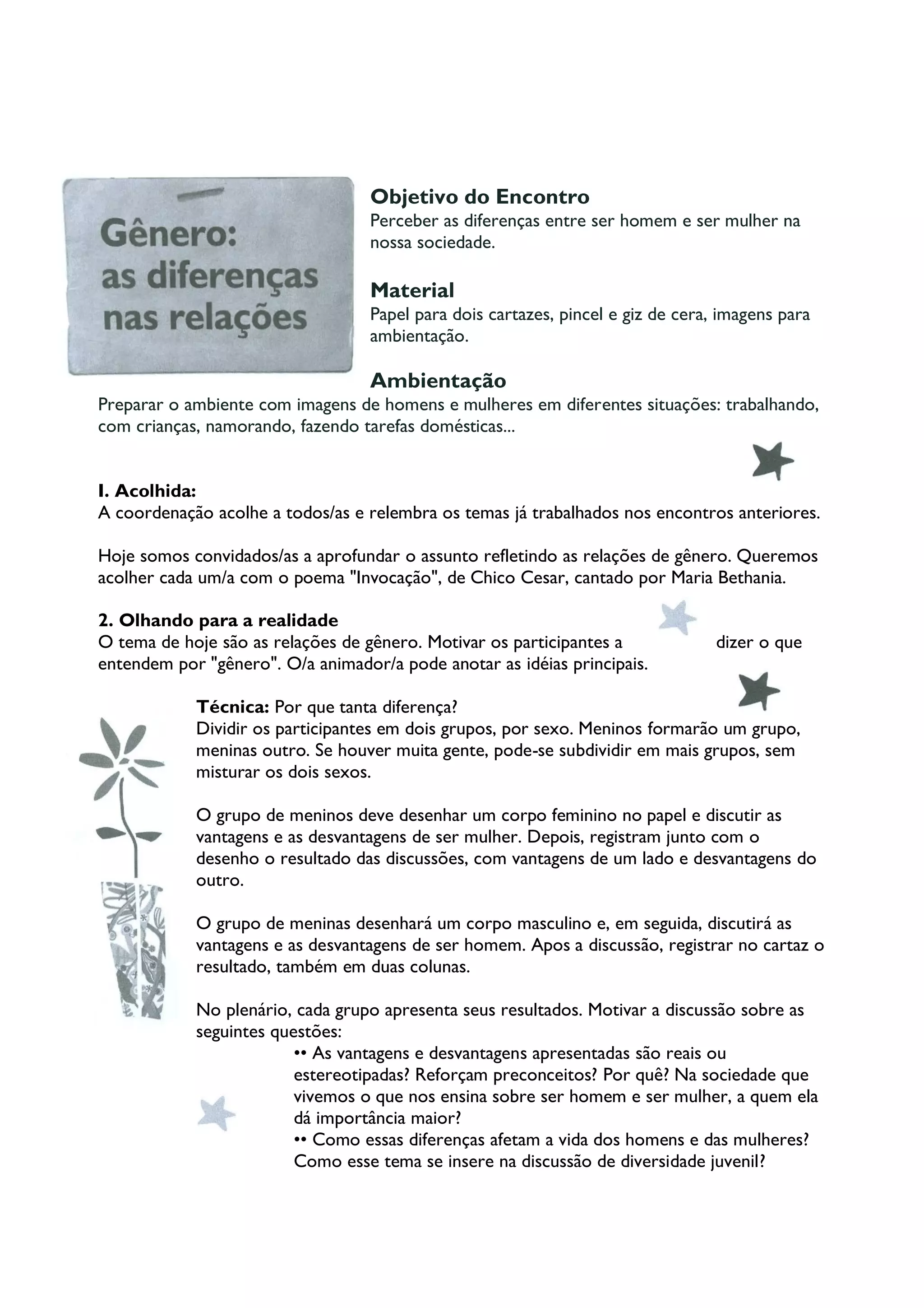 Este documento fornece um roteiro para um encontro sobre as diferenças de gênero na sociedade. Inclui atividades como dividir os participantes por sexo para discutir vantagens e desvantagens de ser homem ou mulher, leituras bíblicas sobre igualdade, e orações para refletir sobre preconceitos. O objetivo é promover o respeito e a valorização igualitária entre os gêneros.