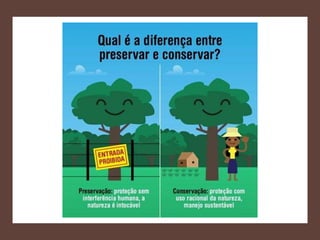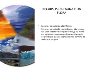 O documento discute a sustentabilidade e os recursos naturais. Ele explica que os recursos naturais não são infinitos e define recursos naturais renováveis e não renováveis. Além disso, aborda a preservação, a conservação e impactos ambientais como queimadas e crescimento urbano. Por fim, define desenvolvimento sustentável e explica os três "Rs" da sustentabilidade: reduzir, reutilizar e reciclar.