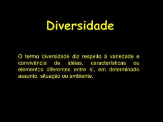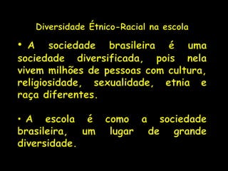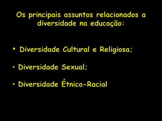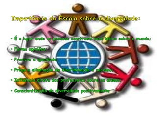 O documento discute a importância da diversidade e do reconhecimento das diferenças nas escolas. A escola deve ser um espaço democrático que trate da diversidade humana e onde todos se sintam reconhecidos. Isso requer valorizar diferentes raças, gêneros e pessoas com deficiência, assim como abordar orientações sexuais de forma respeitosa.