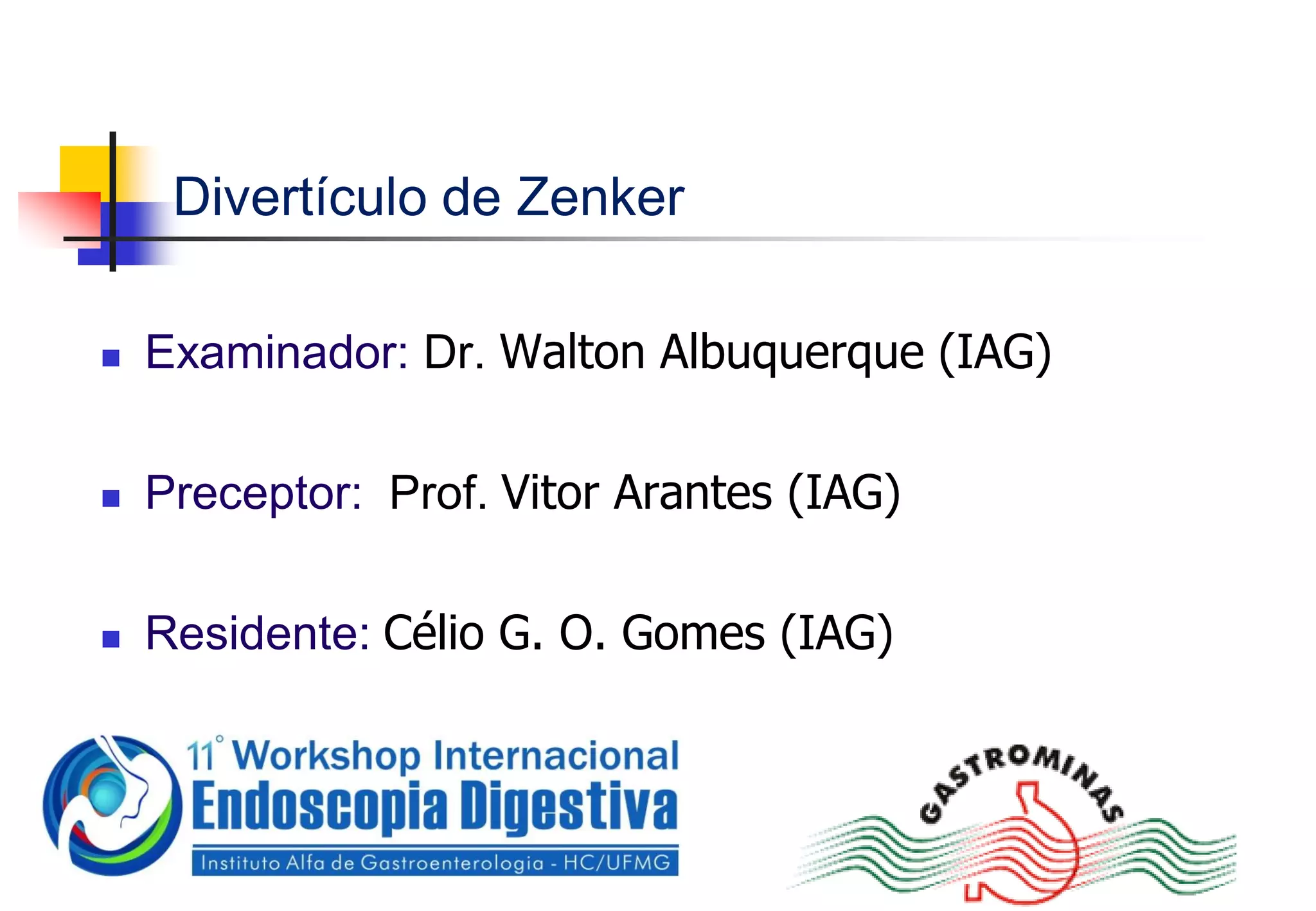 O documento descreve um caso clínico de uma paciente de 83 anos que apresenta disfagia há 3 anos. Após exames, foi diagnosticado um divertículo de Zenker. É proposta uma diverticulotomia endoscópica para tratamento.