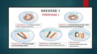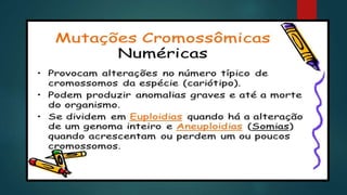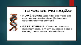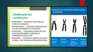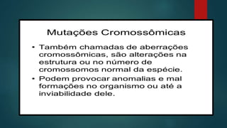 O documento descreve três síndromes genéticas: Síndrome de Down (trissomia do cromossomo 21), Síndrome de Klinefelter (dois cromossomos X e um Y) e Síndrome de Turner (apenas um cromossomo X). Ele fornece detalhes sobre os sinais clínicos e cariótipos associados a cada síndrome.
