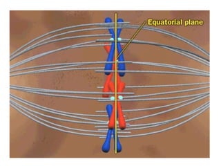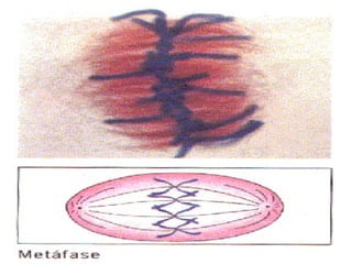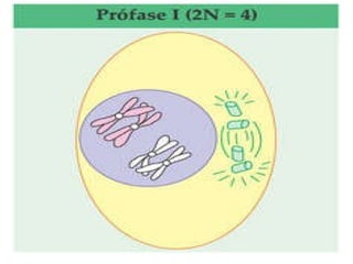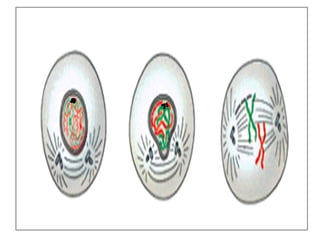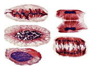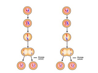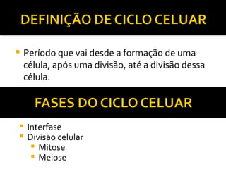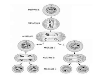 O documento descreve as fases da interfase celular e dos processos de mitose e meiose. A interfase é o período entre divisões celulares e inclui as fases G1, S e G2. A mitose produz duas células idênticas a partir de uma célula, enquanto a meiose produz quatro células haplóides a partir de uma célula diploide em duas divisões. A meiose inclui a meiose I, que reduz o número de cromossomos, e a meiose II, que divide as células