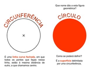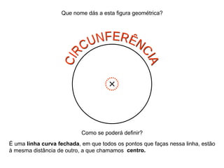 1) O documento descreve vários termos geométricos relacionados a circunferências e círculos como raio, diâmetro, corda e arco de circunferência.