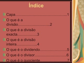 Índice Capa…………………………………...1 Oque é a divisão……………………..2 O que é a divisão exacta…………….3 O que é a divisão inteira……………..4 O que é o dividendo………………….5 O que é o divisor….………………….6 O que é o quociente………………….7 O que é o resto...……………………..8 Conclusão……………………………..9