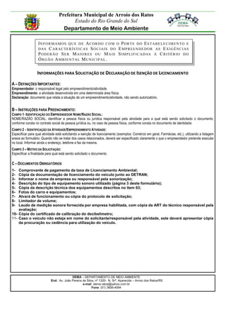 Este documento fornece um formulário e instruções para solicitação de licenciamento ambiental municipal para carros de som e equipamentos afins na cidade de Arroio dos Ratos, Rio Grande do Sul. O formulário solicita informações de identificação do empreendedor, da atividade, dos veículos, e o motivo da solicitação. As instruções detalham os campos do formulário e documentos necessários como comprovante de pagamento de taxa, documentação dos veículos, descrição dos equipamentos sonoros e laudo de medição sonora.