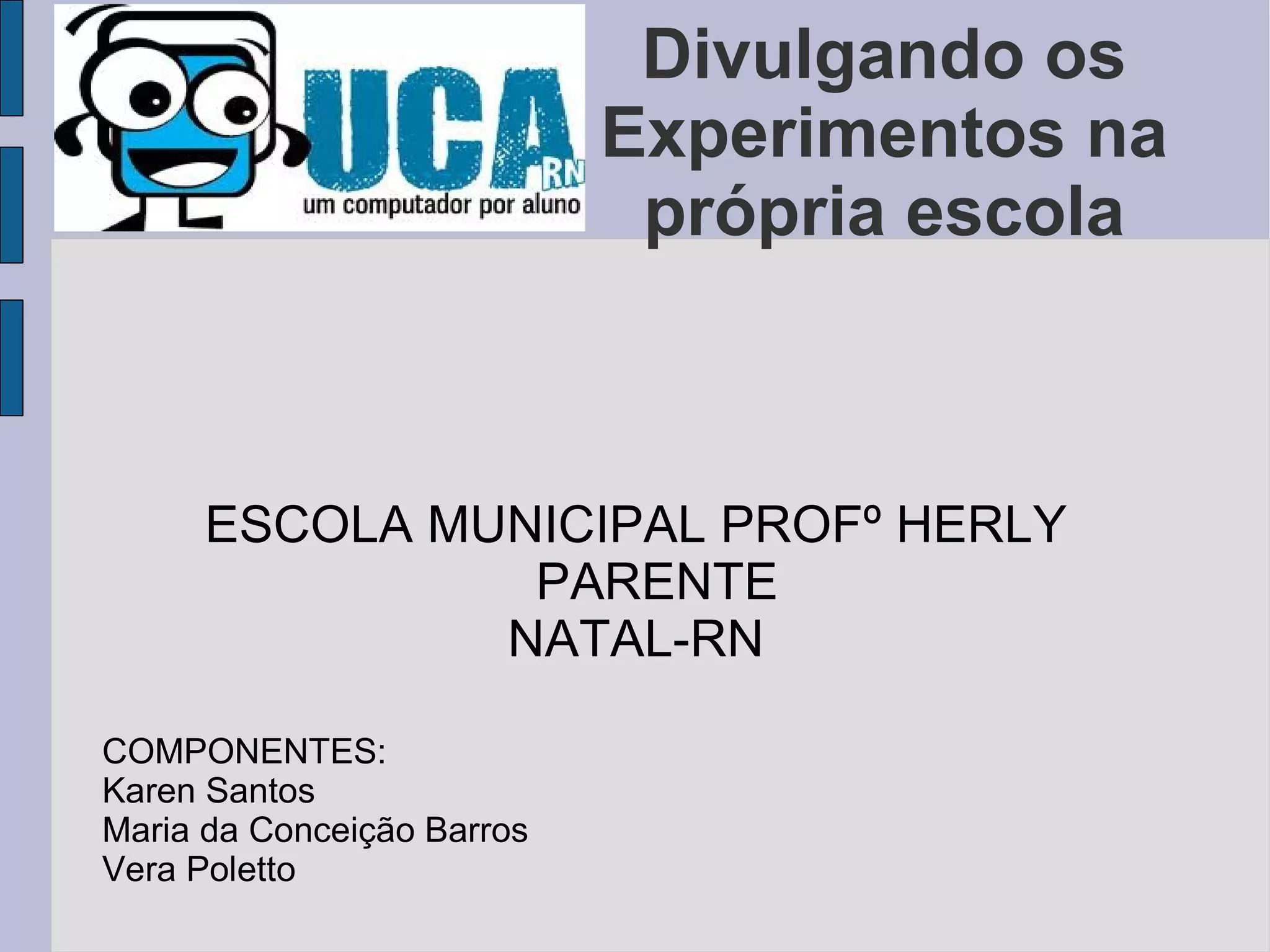 O documento descreve a experiência piloto do projeto UCA (Um Computador por Aluno) em uma escola de São Paulo. Resume os principais desafios enfrentados como problemas técnicos com os laptops, a necessidade de apoio aos professores e a inclusão de todos os alunos nas atividades. Também destaca os objetivos de integrar plenamente a tecnologia na proposta pedagógica da escola municipal de Natal que está implementando o projeto.