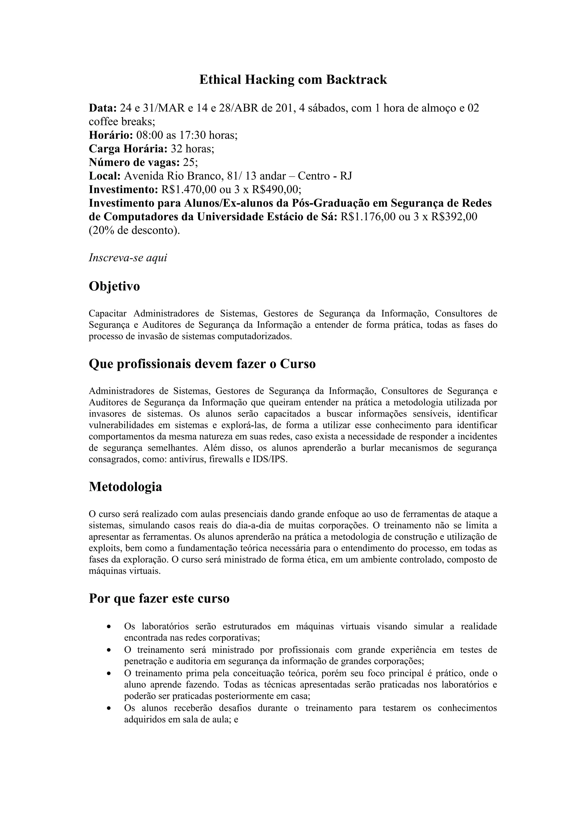 O documento descreve um curso de ética hacker com a ferramenta Backtrack, com 32 horas de duração sobre 4 sábados. O curso ensinará técnicas de hacking ético como reconhecimento de rede, port scanning, exploração de vulnerabilidades e engenharia social usando ferramentas como Nmap, Metasploit e SET.