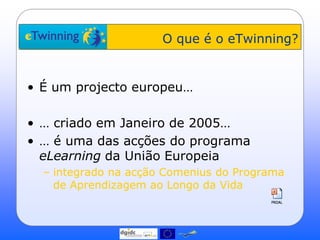 O documento descreve o projeto europeu eTwinning, que permite a colaboração entre escolas europeias. Ele explica que o eTwinning conecta professores e alunos para desenvolver projetos conjuntos utilizando ferramentas digitais. O documento também fornece detalhes sobre como iniciar um projeto eTwinning e os benefícios de participar.
