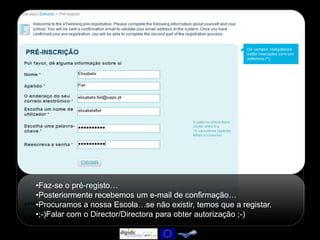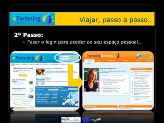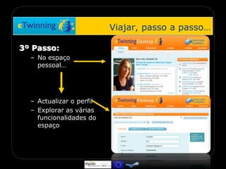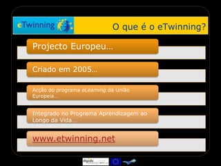 O documento descreve o programa eTwinning, que conecta escolas europeias para projetos colaborativos entre professores e alunos. Ele explica como registrar uma escola no portal eTwinning, encontrar parceiros, iniciar um projeto, gerenciar o projeto no TwinSpace e onde encontrar apoio.