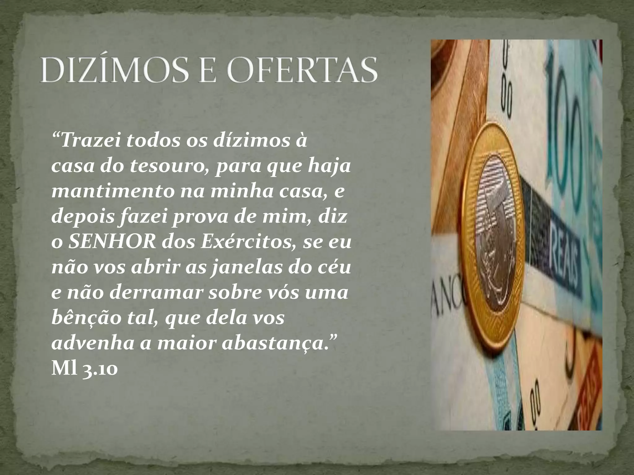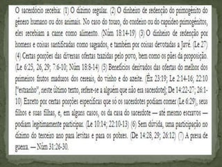 O documento discute os dízimos e ofertas na Lei de Deus. Os israelitas tinham a obrigação de entregar a décima parte das crias dos animais, produtos da terra e outras rendas. Além dos dízimos, oferendas como holocaustos, ofertas de manjares e pacíficas eram trazidas ao Senhor. Estas oferendas simbolizavam a Jesus Cristo e tinham o propósito de reconciliação e adoração.