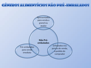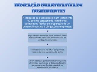O documento estabelece regras para a rotulagem de alimentos embalados e não embalados, incluindo a obrigatoriedade de indicar o nome do fabricante, lista de ingredientes, quantidade líquida, data de validade e outras informações. Também define dispensas e penalizações para o não cumprimento das regras.