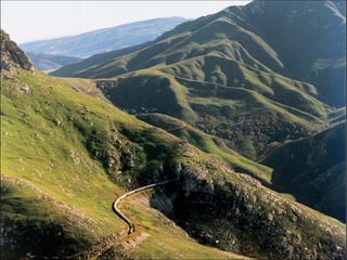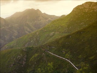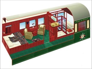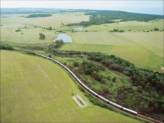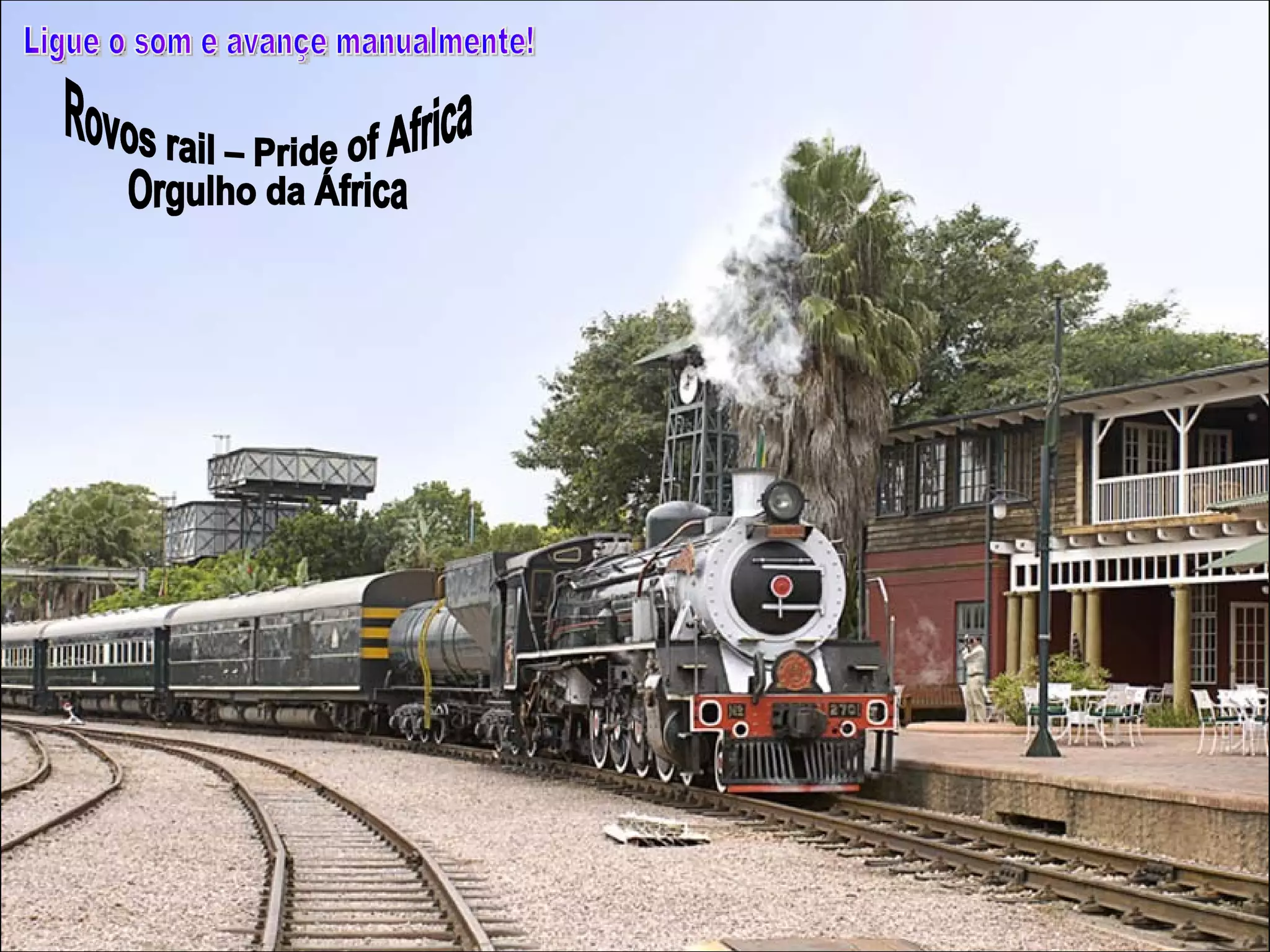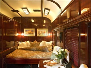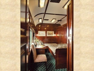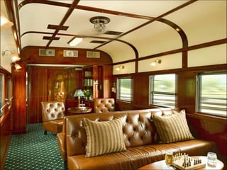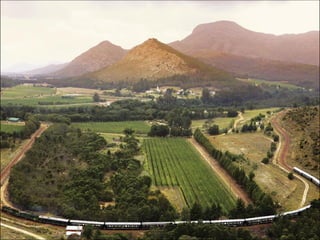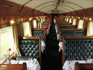 O documento descreve uma viagem de trem através da África chamada Rovos Rail, destacando as paisagens de tirar o fôlego, acomodações confortáveis e requintado restaurante que os passageiros podem desfrutar durante a jornada.