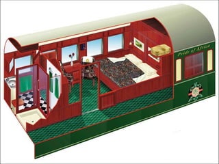 O documento descreve uma viagem de trem através da África chamada Rovos Rail, destacando as paisagens de tirar o fôlego, acomodações confortáveis e requintado restaurante que os passageiros podem desfrutar durante a jornada.