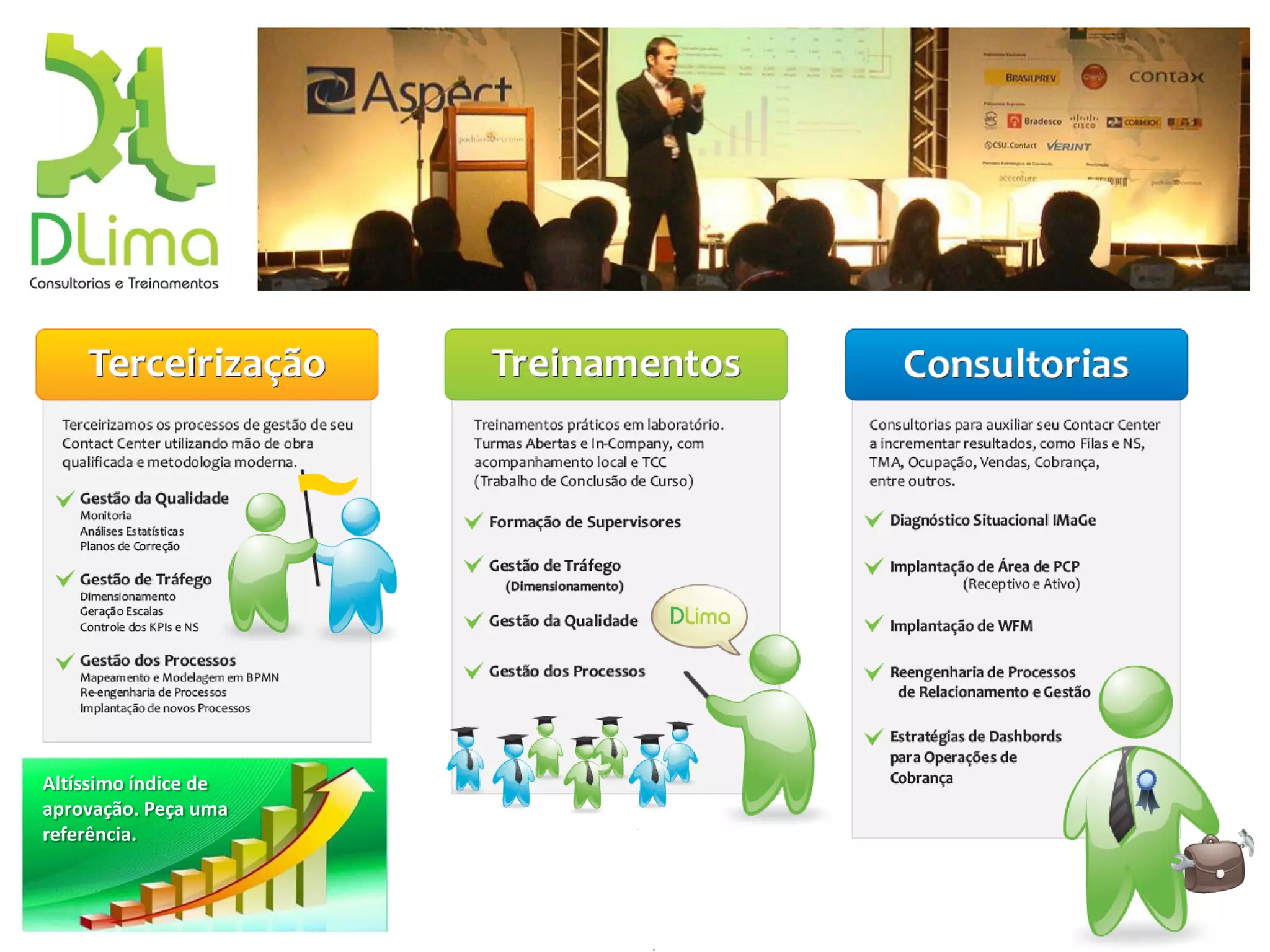 O documento apresenta informações sobre os serviços de uma empresa de consultoria em gestão de contact centers, incluindo: (1) casos de sucesso em diferentes áreas como gestão de tráfego, treinamentos e implantação de WFM; (2) módulos de treinamento oferecidos; (3) metodologia inovadora de aplicação de treinamentos in-company; (4) infraestrutura necessária para os treinamentos; (5) consultorias oferecidas em diagnóstico situacional, projetos de implantação e acompanhamento; (6)