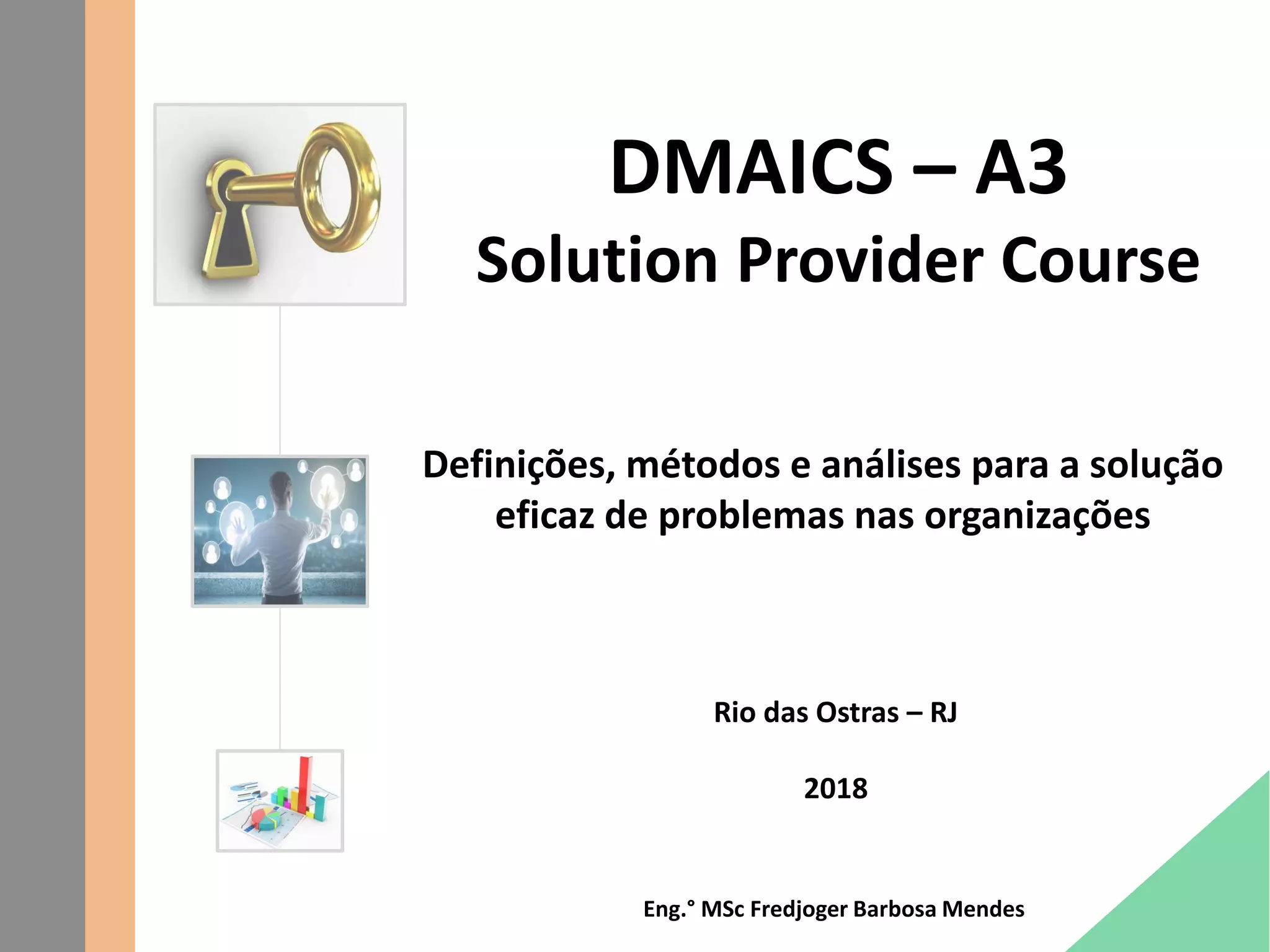 Este documento apresenta um curso sobre a metodologia DMAICS para solução eficaz de problemas, ministrado por Fredjoger Barbosa Mendes. O curso objetiva fornecer conhecimentos básicos sobre identificação, medição, análise e solução de problemas, além de desenvolver habilidades de análise crítica e orientar quanto à postura assertiva para solução de problemas no âmbito corporativo.