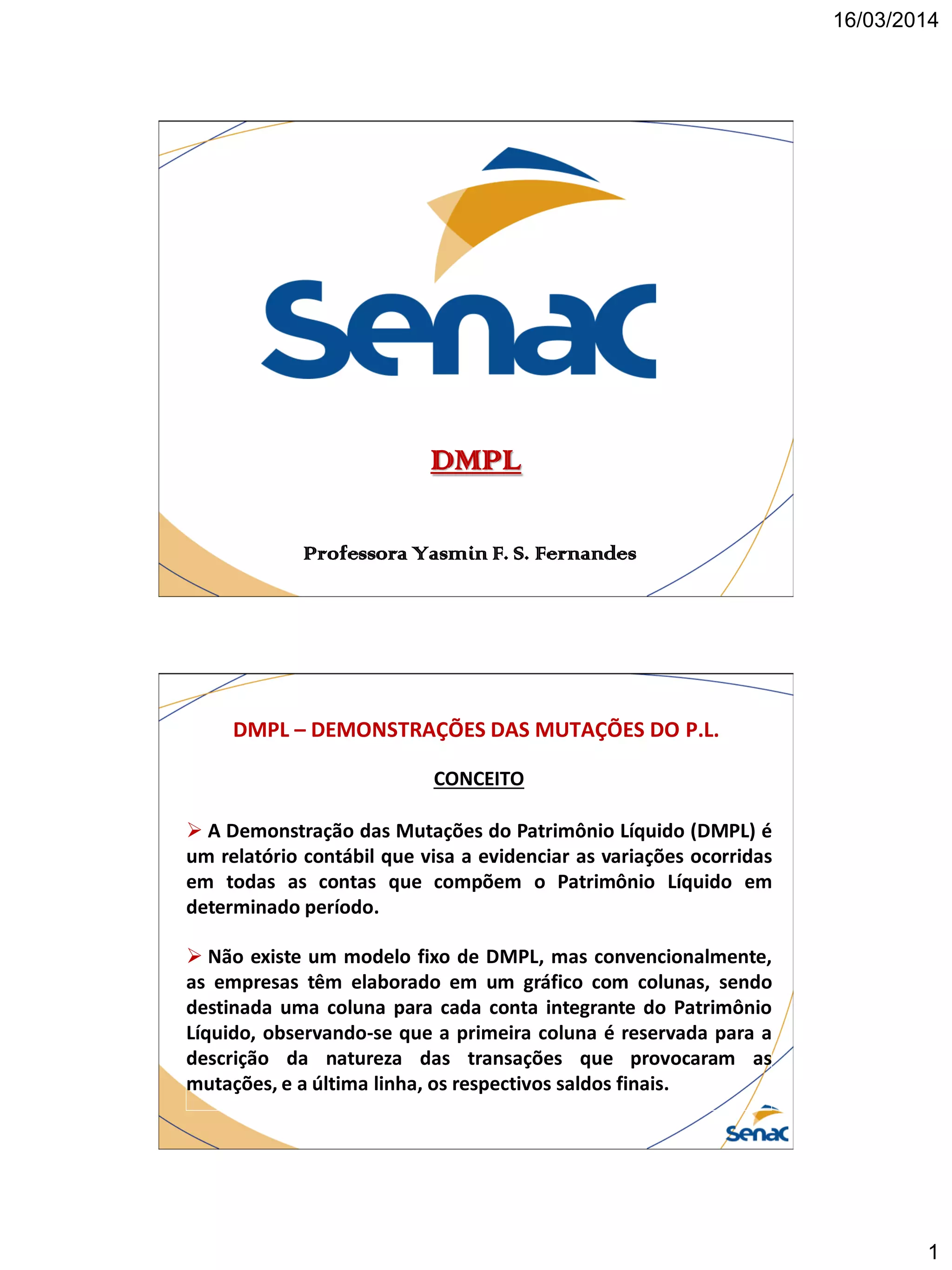 O documento explica o conceito e modelo da Demonstração das Mutações do Patrimônio Líquido (DMPL), que visa evidenciar as variações nas contas do Patrimônio Líquido em determinado período. Também descreve os tipos de reservas que compõem o Patrimônio Líquido, como reservas de lucros, reservas de capital e outras contas.