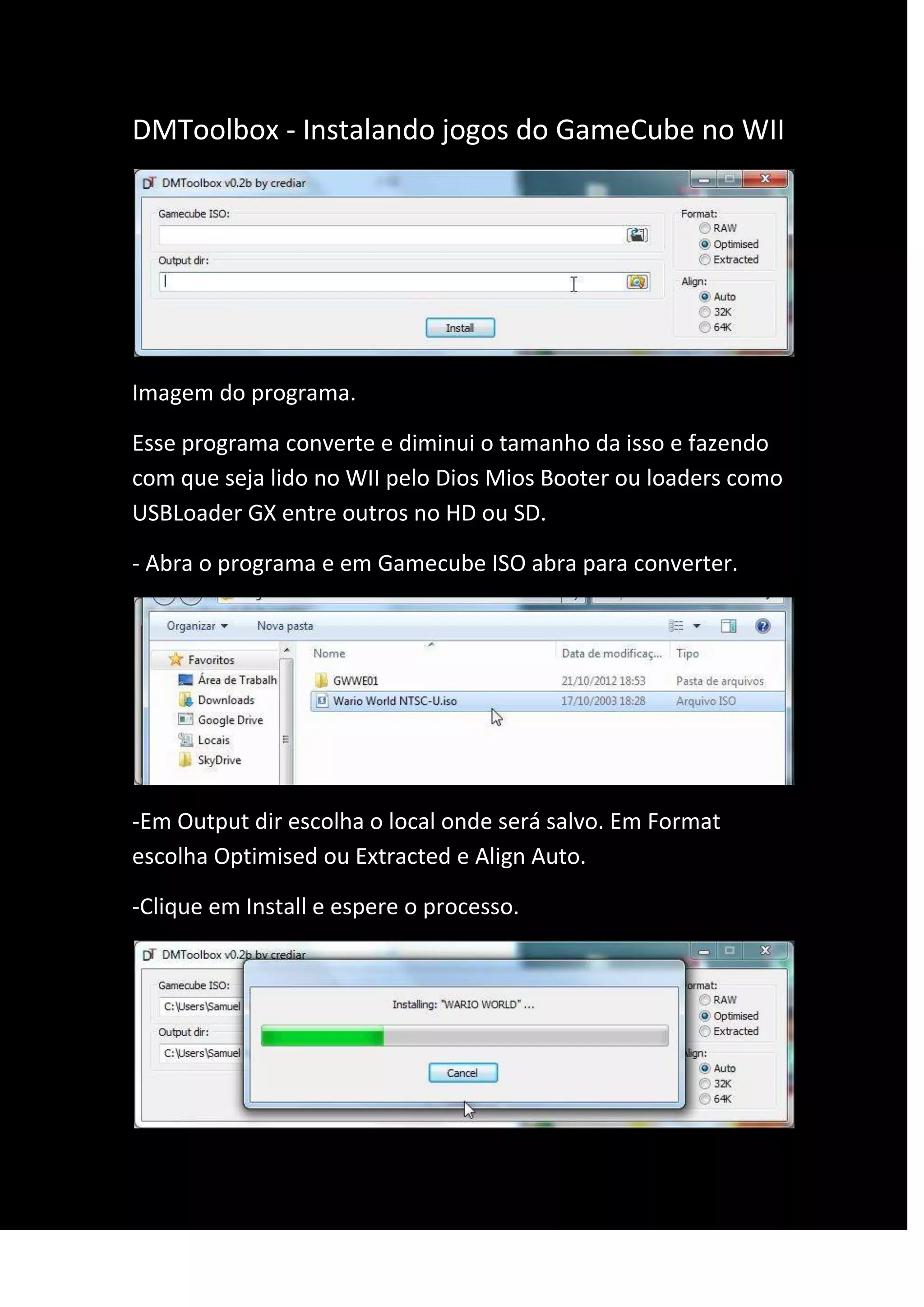 Este documento descreve como converter arquivos ISO de jogos do GameCube para serem lidos no Wii usando o programa DMToolbox. O programa converte os arquivos ISO para um formato menor e os salva em uma pasta que deve ser movida para a pasta GAMES no disco rígido ou cartão SD formatado em FAT32 para ser lido pelo Wii.