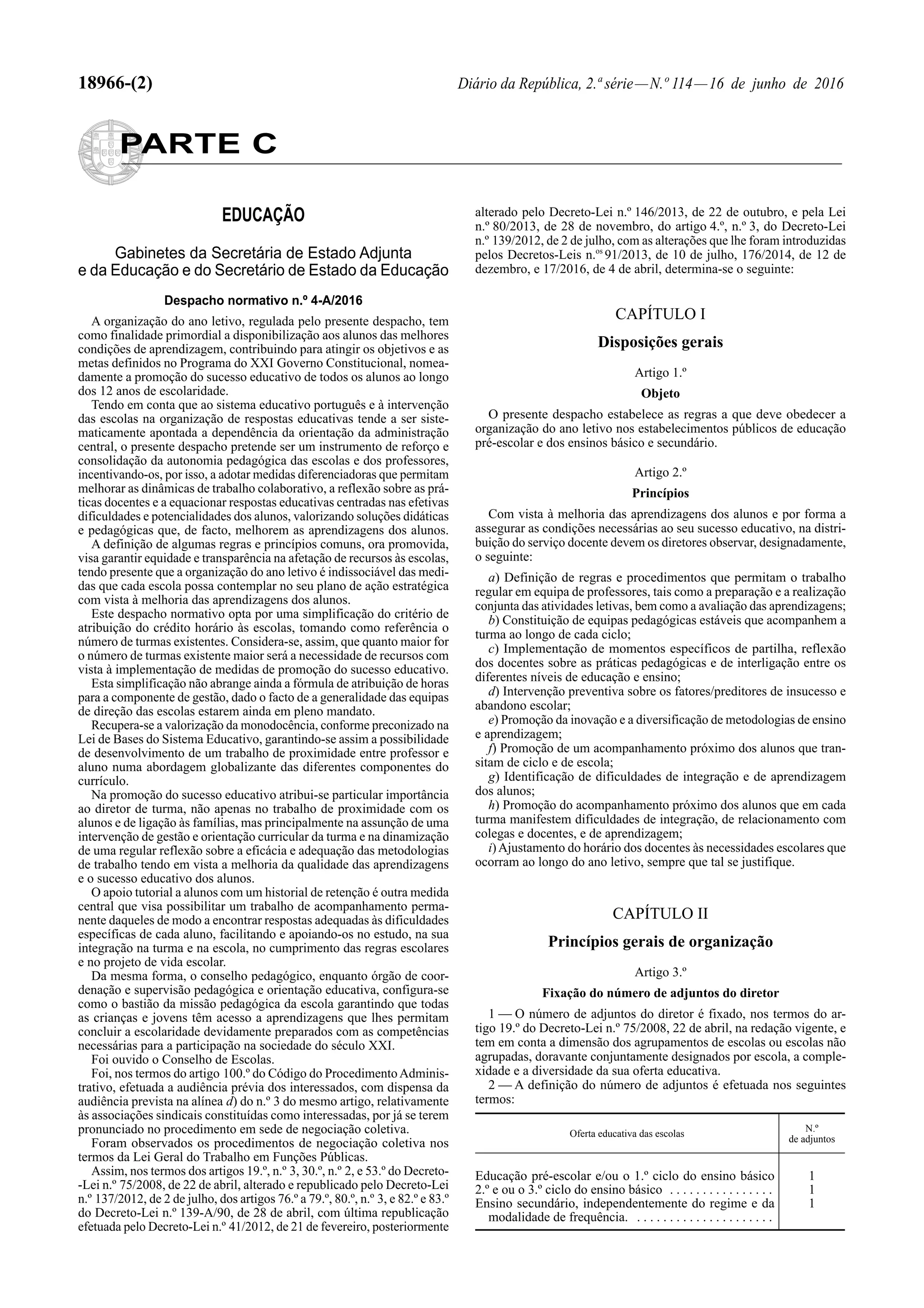 Este documento estabelece regras para a organização do ano letivo nas escolas públicas portuguesas, com o objetivo de promover o sucesso educativo de todos os alunos. Define princípios como a autonomia pedagógica das escolas, o trabalho em equipa de professores e o apoio a alunos com mais dificuldades. Estabelece também critérios para a atribuição de créditos horários às escolas e professores.