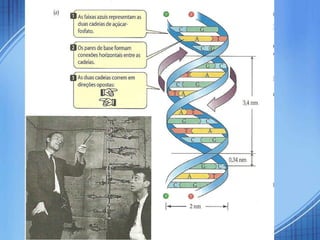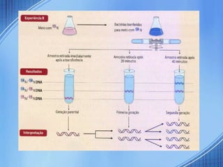 1) O documento descreve a estrutura em dupla hélice do DNA e seu processo de replicação semiconservativa.