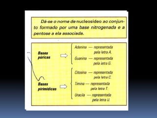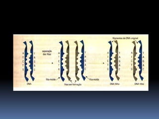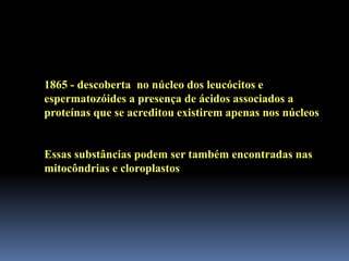 1) O documento descreve a descoberta do DNA e RNA nas células em 1865 e suas estruturas.