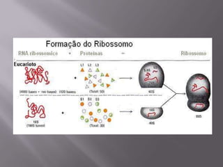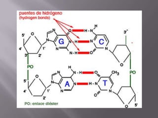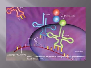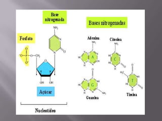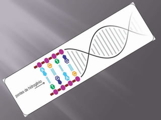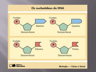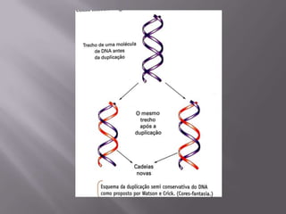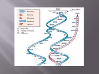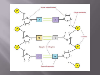 O documento descreve a estrutura e função do DNA e RNA no corpo. Explica que o DNA é formado por nucleotídeos compostos de açúcar, fosfato e bases nitrogenadas. A estrutura em dupla hélice do DNA une as cadeias por ligações de hidrogênio entre as bases nitrogenadas. O RNA difere do DNA apenas na substituição da timina pela uracila e desempenha um papel na síntese de proteínas.